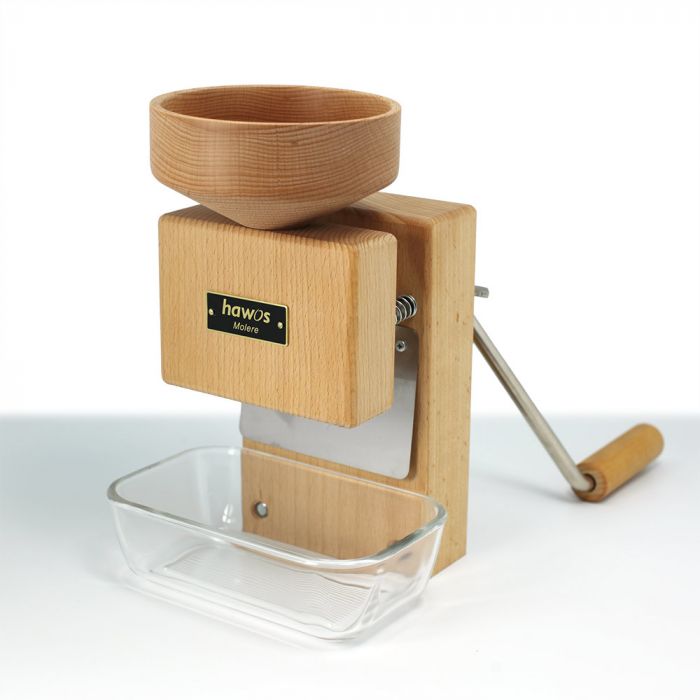 Molere is een handmolen in de herkenbare hawos stijl. Uitgevoerd in massief beukenhout in een mooi klassiek ontwerp. Opmerkelijk aan deze molen is dat de molenstenen vrij toegankelijk zijn en het meel direct vanaf de stenen in de glazen opvangschotel stroomt. De fijnheid van het meel is continu in te stellen door aan de stelschroeven te draaien. De molen is eenvoudig uit elkaar te halen om de stenen te reinigen indien nodig.