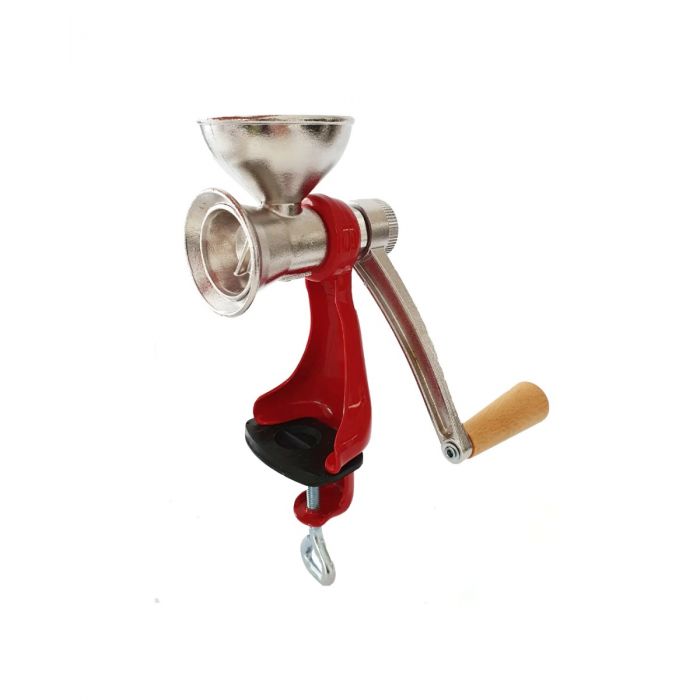 Het hele molenhuis en de trechter zijn van roestvrijstaal. De rode voet heeft een tafelklem voor een stabiele opstelling.
